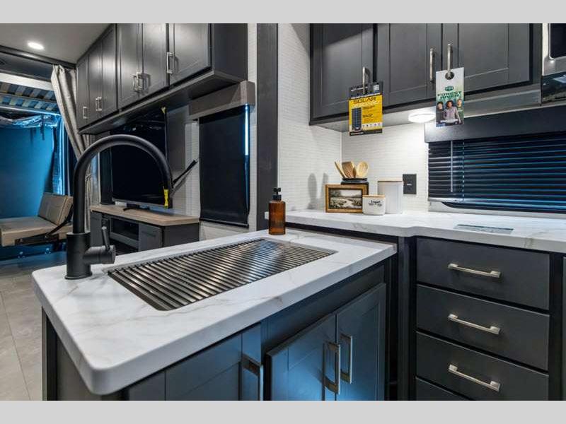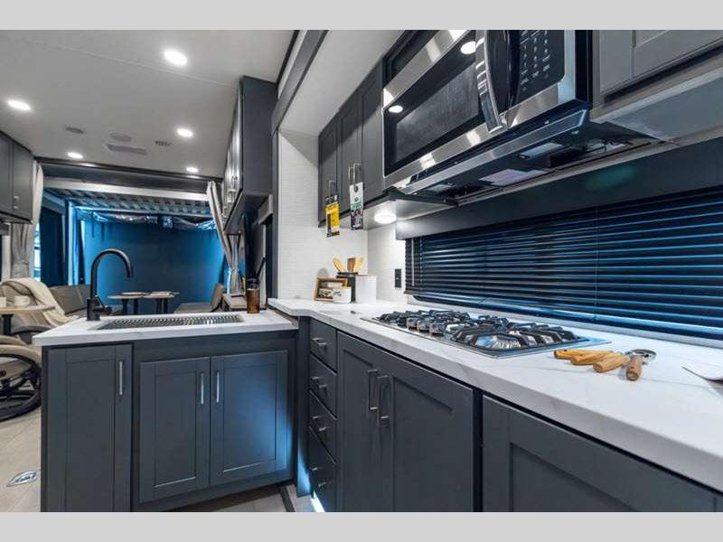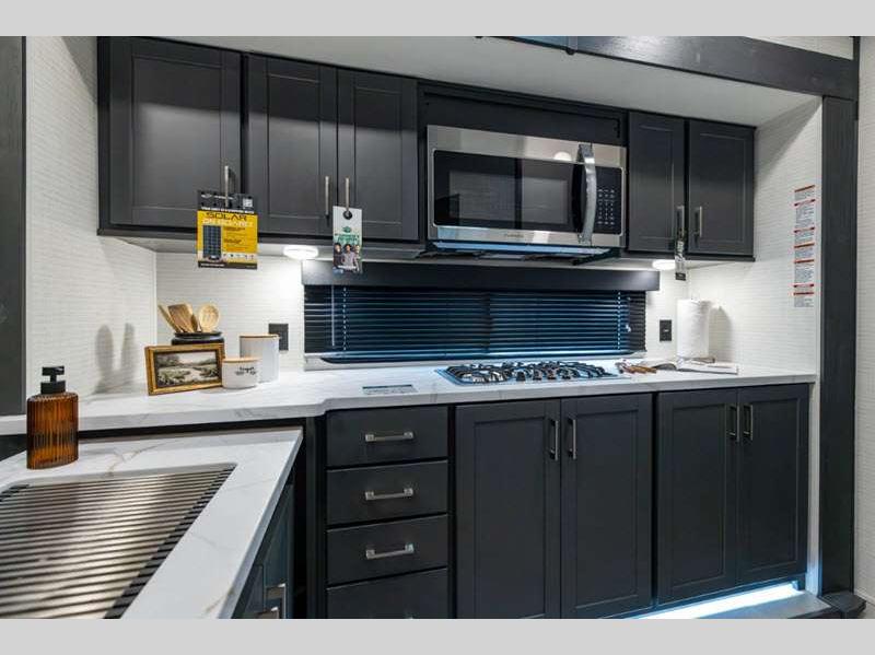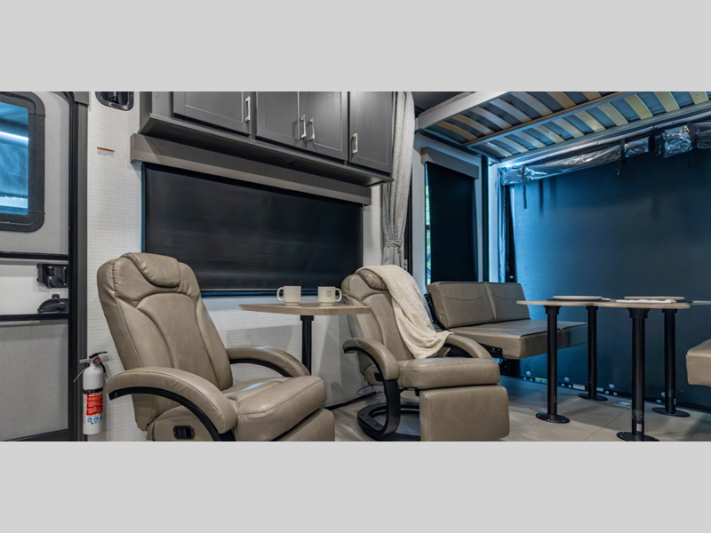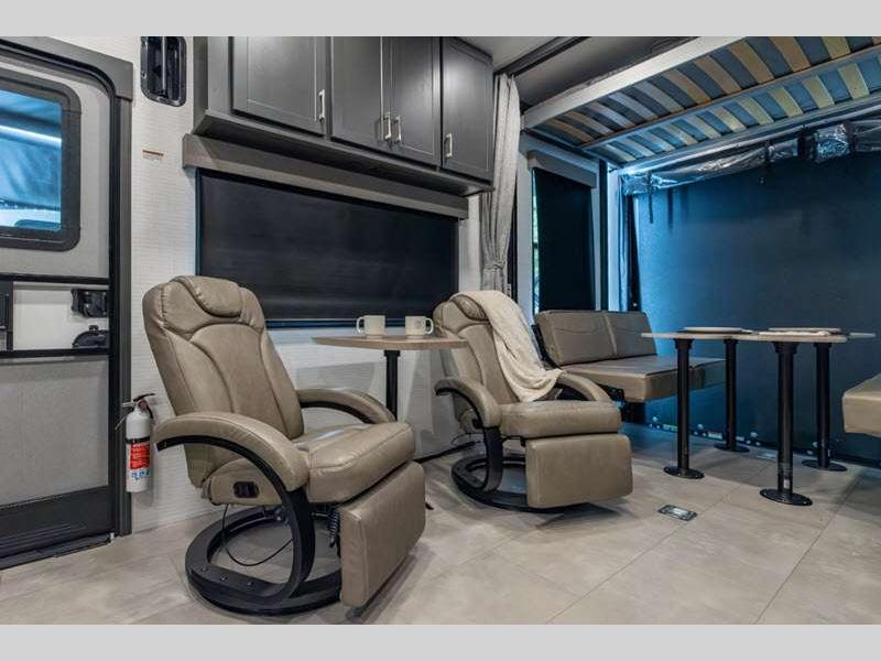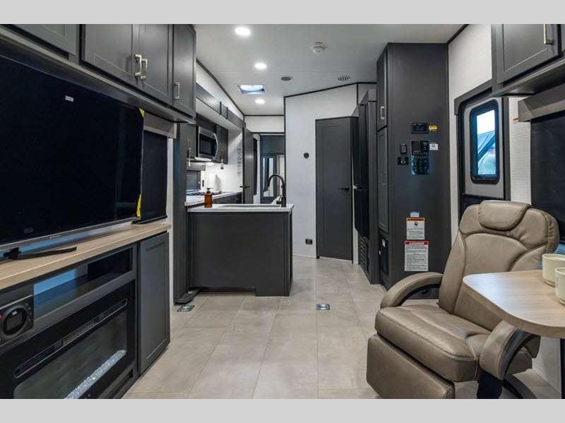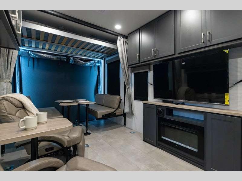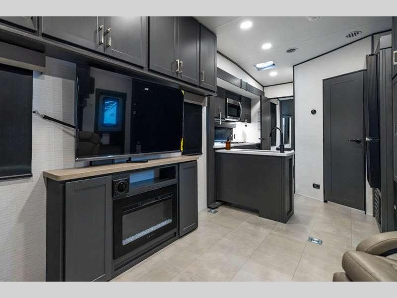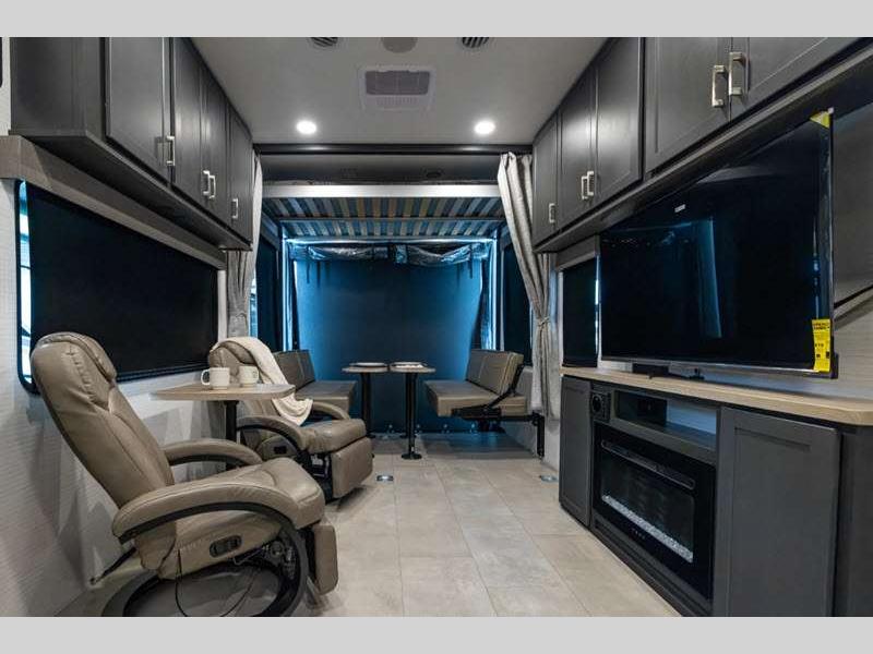 Sleeps 6 Slides 2 Length 34 ft 9 in Ext Width 8 ft 6 in Ext Height 12 ft 9 in Hitch Weight 1550 lbs GVWR 13550 lbs Dry Weight 8978 lbs Cargo Capacity 4572 lbs Fresh Water Capacity 140 gals Grey Water Capacity 65 gals Black Water Capacity 40 gals Fuel Capacity 40 gals Number Of Bunks 1 Available Beds King Refrigerator Type 12V Convection Cooking Yes Cooktop Burners 2 Number of Awnings 1 Garage Size 15 ft 1 in LP Tank Capacity 20 lbs Water Heater Type Tankless AC BTU 15000 btu TV Info LR Smart TV Axle Count 2 Number of LP Tanks 2 Shower Type Standard Similar Floorplans