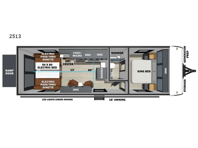 Sleeps 6 Length 0 ft Ext Width 0 ft Ext Height 0 ft Int Height 0 ft Tire Size 16" Furnace BTU 35000 btu Fuel Capacity 40 gals Refrigerator Type 12 Refrigerator Size 10.7 cu ft Number of Awnings 1 Garage Size 13 ft LP Tank Capacity 30 lbs Water Heater Type Tankless AC BTU 30000 btu Awning Info 18' With LED Lights Axle Count 2 Number of LP Tanks 2 Shower Type Standard Solar Wattage 200 watts Similar Toy Hauler Travel Trailer Floorplans