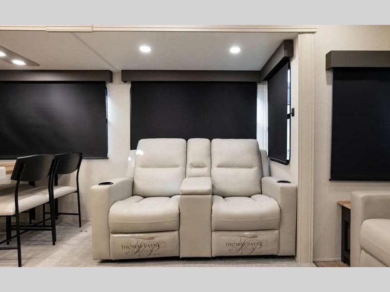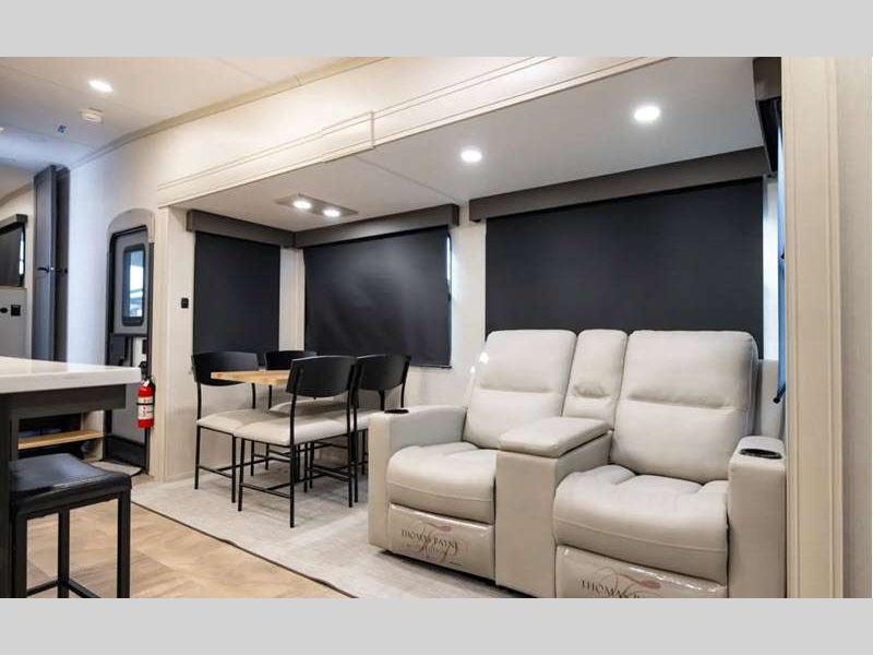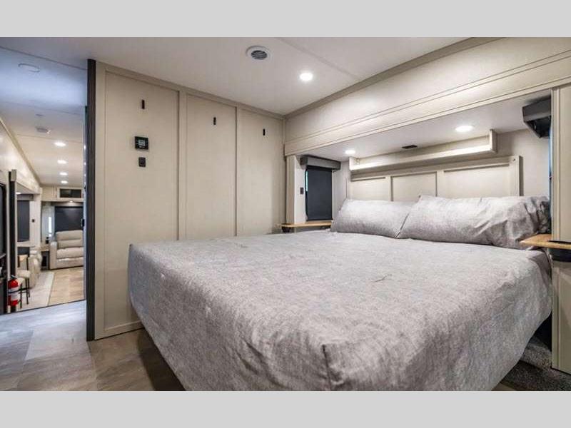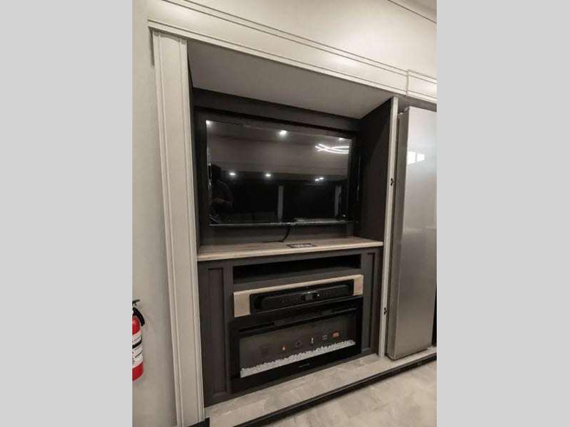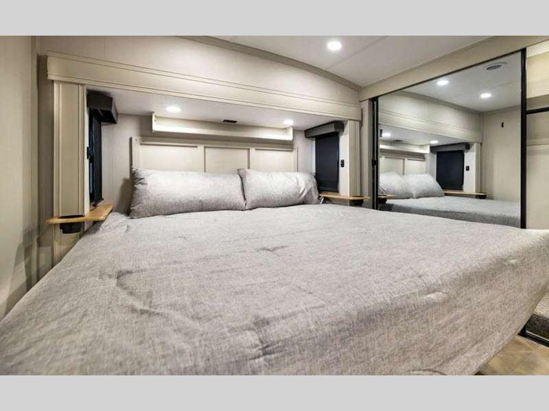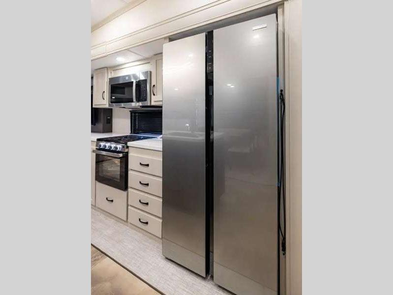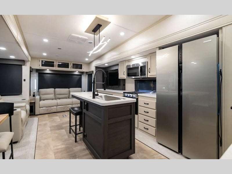 Sleeps 10 Slides 2 Length 42 ft 7 in Ext Width 8 ft Ext Height 13 ft Interior Color Shimmer, Slate Hitch Weight 2008 lbs GVWR 14500 lbs Dry Weight 11542 lbs Cargo Capacity 2958 lbs Fresh Water Capacity 48 gals Grey Water Capacity 135 gals Black Water Capacity 90 gals Tire Size 16" Number Of Bunks 2 Available Beds King Refrigerator Type Side by Side Stainless Glass 12V Refrigerator Size 16 cu ft Cooktop Burners 3 Number of Awnings 1 Water Heater Type On Demand AC BTU 27000 btu TV Info LR 50" 4K Smart LED TV Awning Info 20' Electric w/LED Light Strip & One Hand Pitch Adjustment Axle Count 2 Washer/Dryer Available Yes Shower Type Shower w/Seat Electrical Service 50 amp Similar Floorplans